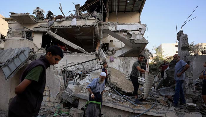 • Palestinians inspect the site of an overnight Israeli strike on a house, in Gaza City.